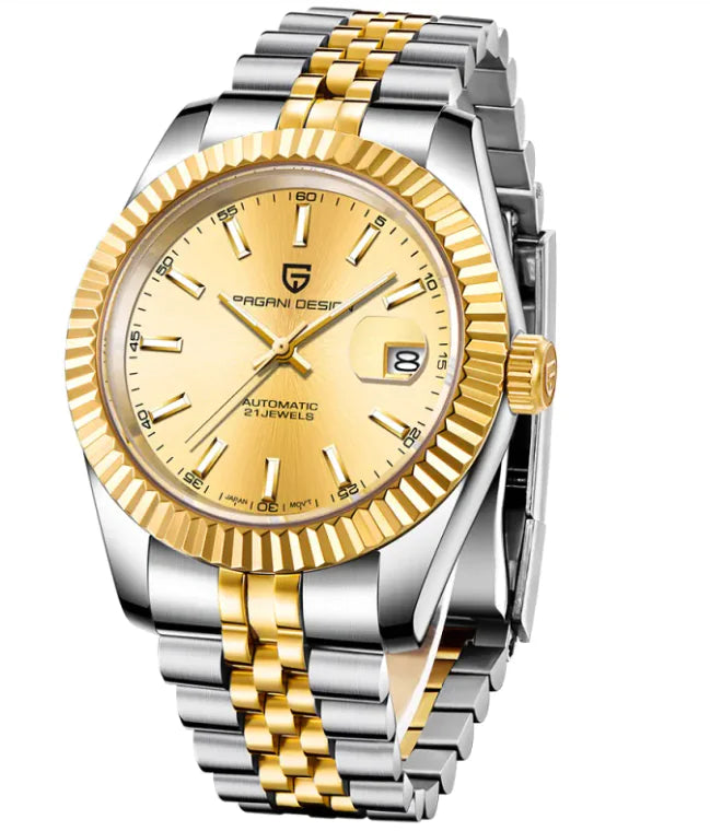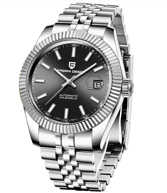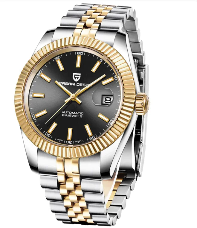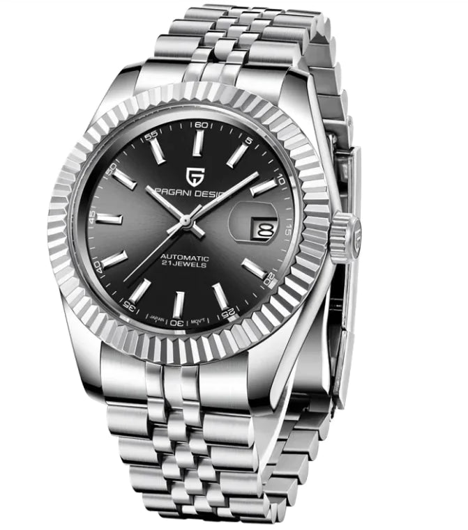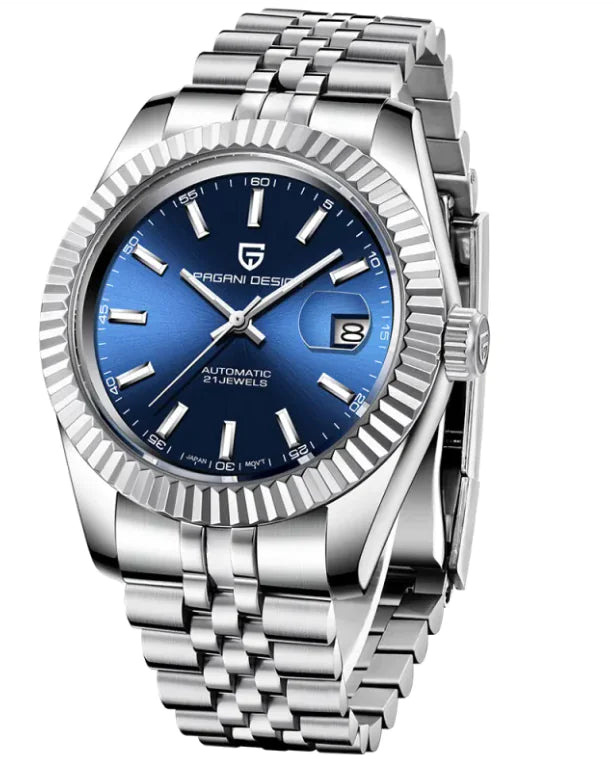 This watch features a durable stainless steel case, a high-quality Citizen 8215 movement, and a scratch-resistant sapphire synthetic glass mirror. With multiple stylish color and strap options, it is designed for both functionality and elegance, offering a waterproof feature and a sleek look for daily wear.